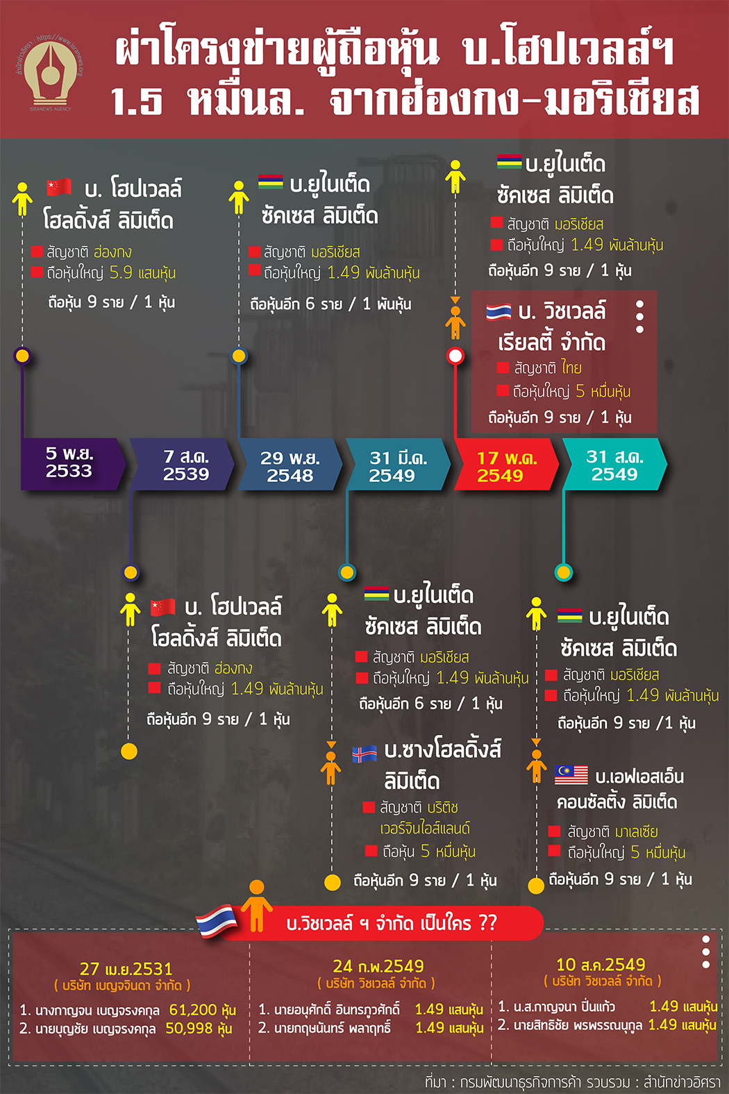INFO: ผ่าโครงข่ายผู้ถือหุ้น บ.โฮปเวลล์ฯ 1.5 หมื่นล้าน ผู้ชนะคดีค่าชดเชย 1.2 หมื่นล. การรถไฟฯ บริษัท โฮปเวลล์ โฮลดิ้งส์ ลิมิเต็ด สัญชาติฮ่องกง ถือหุ้นใหญ่ ก่อนโอนทั้งหมดให้ บ.ยูไนเต็ด ซัคเซส ลิมิเต็ด มอริเชียส ตัด 50 ล้านหุ้นให้ ซางโฮลดิ้งส์ ลิมิเต็ด บริติชเวอร์จินไอส์แลนด์ แล้วโอนกลัมมาบริษัท วิชเวลล์ เรียลตี้ ในไทย สุดท้ายไปจบที่ บ.จดทะเบียนในมาเลเซีย