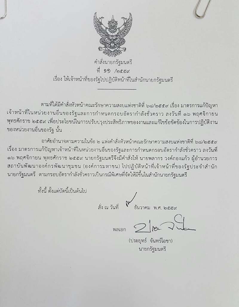 คำสั่งนายกรัฐมนตรี ที่ 11/2559 เรื่องให้เจ้าหน้าที่ของรัฐไปปฏิบัติหน้าที่ในสำนักนายกรัฐมนตรี ตามที่ได้มีคำสั่งหัวหน้าคณะรักษษความสงบแห่งชาติที่ 68 /2559 เรื่องมาตรการการแก้ไขปัญหาเจ้าหน้าที่ในหน่วยงานอื่นของรัฐและการกำหนดกรอบอัตรากำลังชั่วคราว ลงวันที่ 10 พฤศจิกายน 2559 เพื่อประโยชน์ในการปรับปรุงประสิทธิภาพของงานและแก้ไขข้อขัดข้องในการปฏิบัติงานหน่วยงานอื่นของรัฐนั้น