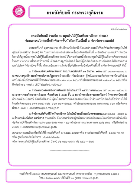 จากความเคลื่อนไหวทั้งหมด ทำให้กรมบังคับคดี โดย รื่นวดี สุวรรณมงคล อธิบดีกรมบังคับคดี จับมือกับกองทุนเงินให้กู้ยืมเพื่อการศึกษา หรือ กยศ. จัดมหกรรมไกล่เกลี่ยข้อพิพาทชั้นบังคับคดีในพื้นที่สามจังหวัดชายแดนใต้ เพื่อเปิดโอกาสให้ลูกหนี้ได้เจรจาชำระหนี้กับ กยศ. พร้อมหาแนวทางในการชำระหนี้เพื่อลดการถูกบังคับคดี โดยมีผู้ไกล่เกลี่ยของกรมบังคับคดีเป็นคนกลาง งานนี้ไม่เสียค่าใช้จ่ายใดๆ ทั้งสิ้น โดยจัดจัดกิจกรรมที่จังหวัดยะลา วันที่ 13 ธ.ค. จังหวัดปัตตานี วันที่ 15 ธ.ค. และจังหวัดนราธิวาส วันที่ 25 ธ.ค.