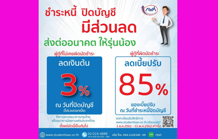 หนึ่งในของขวัญจาก กยศ. ก็คือ การตอบแทนกลุ่มผู้กู้ที่ไม่เคยผิดนัดชำระหนี้ และผู้กู้ที่อยู่ในช่วงปลอดหนี้ หากปิดบัญชีจะได้ลดหย่อนหนี้ 3% ทันที พร้อมออกมาตรการจูงใจชั่วคราวสำหรับผู้กู้ยืมที่ผิดนัดชำระหนี้ หากปิดบัญชีจะได้ลดเบี้ยปรับถึง 85% ตั้งแต่วันนี้ถึง 31 พ.ค.62 เท่านั้น