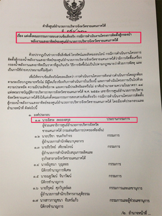 บรรยายภาพ : คำสั่งตั้งคณะกรรมการสอบสวนข้อเท็จจริงโครงการติดตั้งตู้กรองน้ำพลังงานแสงอาทิตย์