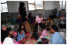 3 ภาพล่าง - ชาวบ้านต้องไปอาศัยที่โรงเรียนตาดีกาอย่างแออัด โดยมีชาวบ้านจากพื้นที่อื่นช่วยบริจาคเสื้อผ้า และ ส.ว.อนุศาสตร์ เดินทางเข้าไปเยี่ยม