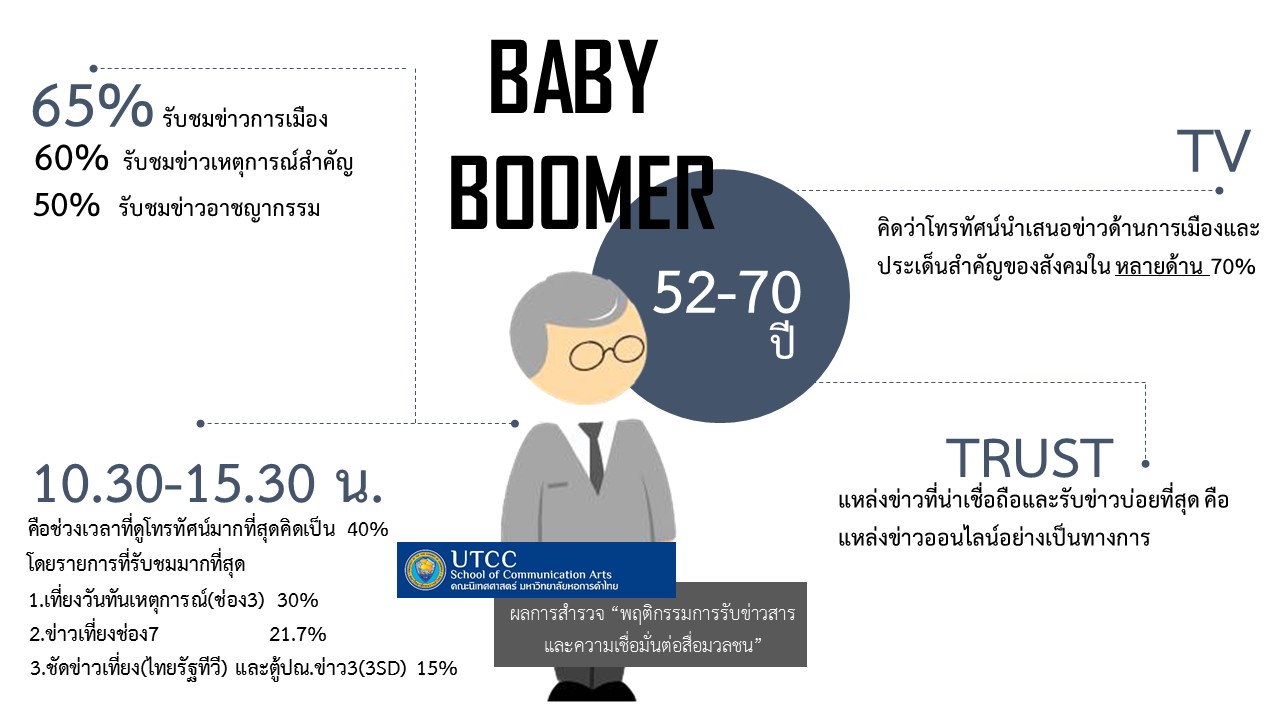กลุ่มเบเบี้บูมเมอร์ อายุระหว่าง 52-70 ปี มี พฤติกรรมทั่วไปในการรับข่าวสารทางโทรทัศน์บ่อยที่สุด รองลงมาคือหนังสือพิมพ์ สื่อสังคมออนไลน์ หรือโซเชียลมีเดีย เว็บไซต์ แอพพลิเคชั่น และวิทยุ ตามลำดับ