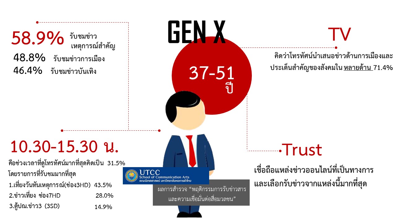 นอกจากนี้ ผลวิจัย ยังพบว่า เจเนอเรชั่น X อายุระหว่าง 37-51 ปี มีพฤติกรรมในการรับข่าวสารคือ FOMO (Fear of Missing Out) คนกลุ่มนี้กลัวตกข่าว จึงรับข่าวสารทางออนไลน์ผ่านสำนักข่าวที่เป็นทางการและคนใกล้ชิด ติดตามข่าว ทางสื่อใหม่เพื่อให้ทันกระแสสังคมแต่ไม่ได้ให้ความเชื่อถือ โดยเฉพาะข่าวทางสื่อสังคมออนไลน์หรือโซเชียลเน็ตเวิร์คที่จะให้ความเชื่อถือในระดับน้อย แต่ให้ความเชื่อถือในสื่อที่เป็นประเภทสื่อดั้งเดิมในระดับมาก คนกลุ่มนี้เป็นกลุ่มคนที่รับข่าวสารผ่านทางสื่อโทรทัศน์มากกว่าสื่ออื่น โดยเชื่อว่าการนำเสนอข่าวด้านการเมืองและประเด็นสำคัญของสังคมจากสื่อโทรทัศน์เป็นการนำเสนอข้อมูลในหลายด้าน
