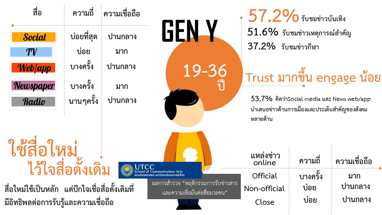 กลุ่มต่อมาคือ เจนเนอเรชั่น Y อายุระหว่าง 19-36 ปี กลุ่มนี้รับข่าวสารผ่านช่องทางสื่อสังคมออนไลน์หรือโซเชียลมีเดียบ่อยที่สุด รองลงมาคือสื่อโทรทัศน์ เว็บไซต์หรือแอพพลิเคชั่นข่าว หนังสือพิมพ์ และวิทยุ ตามลำดับ แม้จะรับข่าวสารทางสื่อใหม่มากแต่คนนี้ให้ความเชื่อถือในสื่อโทรทัศน์และหนังสือพิมพ์ มากกว่าข่าวสารจากสื่อใหม่ แต่มีแนวโน้มที่จะเชื่อถือในสื่อใหม่มากขึ้น โดยต้นตอข่าวทางออนไลน์ที่เจนเนอเรชั่น Y รับข่าวสารบ่อย คือสำนักข่าวที่ไม่เป็นทางการและรับข้อมูลข่าวสารจากคนใกล้ชิด บ่อยครั้งกว่าสำนักข่าวที่เป็นทางการ และคิดว่าข่าวสารที่รับจากในสื่อใหม่นั้นมีการนำเสนอข่าวการเมืองและประเด็นสำคัญทางสังคมหลายด้าน