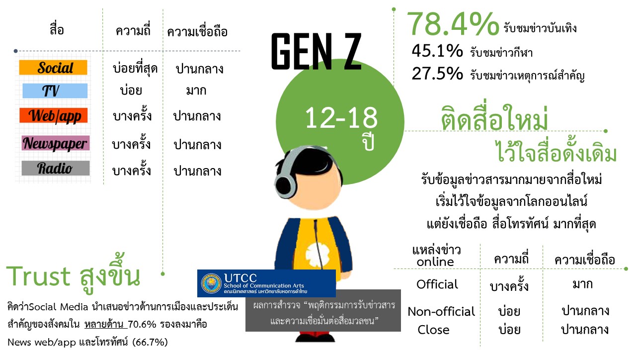 กลุ่มสุดท้ายคือ เจเนอเรชั่น Z อายุระหว่าง 12-18 ปี เป็นกลุ่มที่มีพฤติกรรมในการรับข่าวสารทางสื่อสังคมออนไลน์หรือโซเชี่ยวเน็ตเวิร์คบ่อยที่สุด มากกว่าเจนเนอเรชั่นอื่น ๆ รองลงมาคือสื่อโทรทัศน์ สื่อเว็บไซต์หรือแอพพลิเคชั่นข่าว หนังสือพิมพ์ และวิทยุ