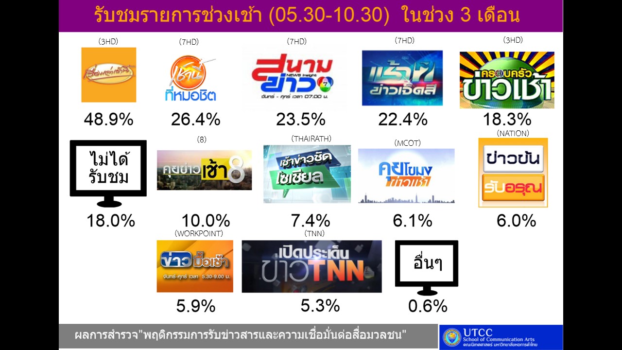 ส่วนพฤติกรรมการรับชมข่าวทางสถานีโทรทัศน์ ในระยะเวลา 3 เดือนพบว่า รายการข่าวช่วงเช้าที่มีคนรับชมมากที่สุดคือ เรื่องเล่าเช้านี้ ช่อง 3 HD 48.9% รองลงมาคือเช้านี้ที่หมอชิต 26.4% รายการข่าวช่วงเที่ยง คือ เที่ยงวันทันเหตุการณ์ ช่อง 3 HD และรายการห้องข่าวภาคเที่ยง ช่อง 7 HD 23 %