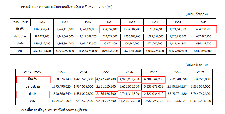 จากตารางที่ 1.6 อาจสรุปได้ว่า งบประมาณรายจ่ายของรัฐบาลด้านยาเสพติดระหว่างปี 2542 – 2559 รวมกันเท่ากับ 91,819.60 ล้านบาท หรือเฉลี่ยงบประมาณการปราบปรามยาเสพติดในช่วง ระหว่างปี 2542 – 2559 เท่ากับ 5,101.01 ล้านบาทต่อปี
