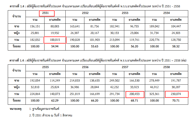 ประการที่สอง เป็นที่น่าสังเกตว่า ในขณะงบประมาณที่ใช้ในการปราบปรามยาเสพติด ในระหว่างปี 2542 – 2559 นั้นเพิ่มสูงขึ้นโดยตลอด แต่ในขณะเดียวกันจํานวนนักโทษยาเสพติดก็เพิ่มสูงขึ้นโดยตลอดเช่นเดียวกัน กล่าวคือในปี 2551 จํานวนนักโทษยาเสพติดมีจํานวน 100,105 คน ได้เพิ่มเป็น 230,074 คน ในปี 2558 หรือเพิ่มขึ้นกว่าเท่าตัว