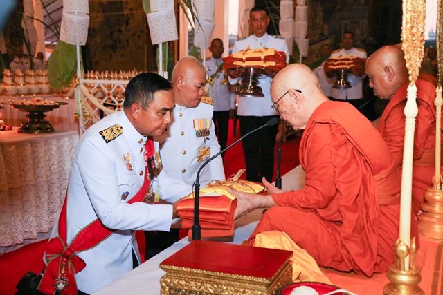 นายกรัฐมนตรี เปิดกรวยกระทงดอกไม้ธูปเทียนแพ ถวายราชสักการะ ถวายความเคารพ ณ ด้านหน้าพระฉายาลักษณ์ สมเด็จพระเจ้าอยู่หัวเจ้า เจ้าหน้าที่กรมศาสนาอาราธนาศีล สมเด็จพระสังฆราชให้ศีล นายกรัฐมนตรีถวายเทียนชนวนแด่สมเด็จพระสังฆราช
