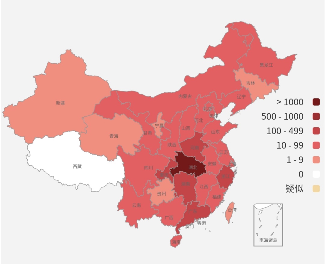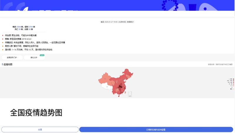รายงานสถานการณ์ไวรัสโคโรน่าแบบเรียลไทม์จากจีนแผ่นดินใหญ่ โดยใช้ภาษาจีน ข้อมูลประกอบด้วยจำนวนผู้ป่วย แผนที่การระบาด