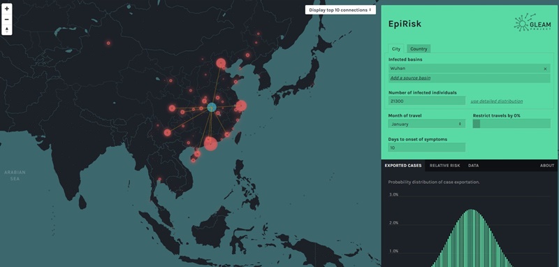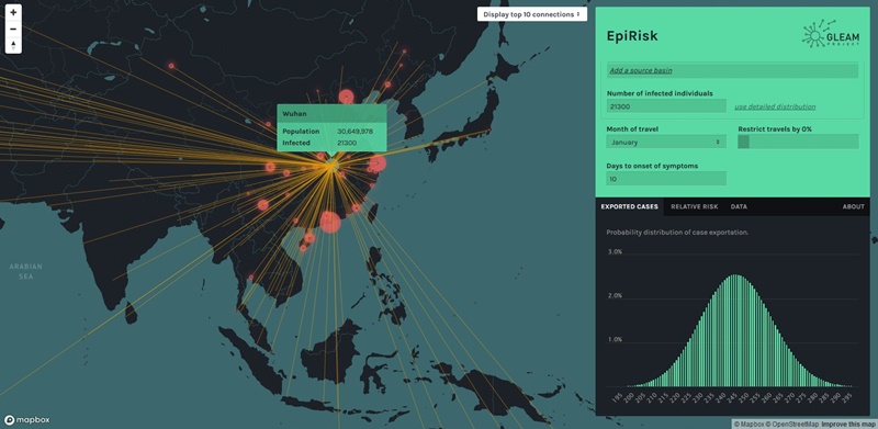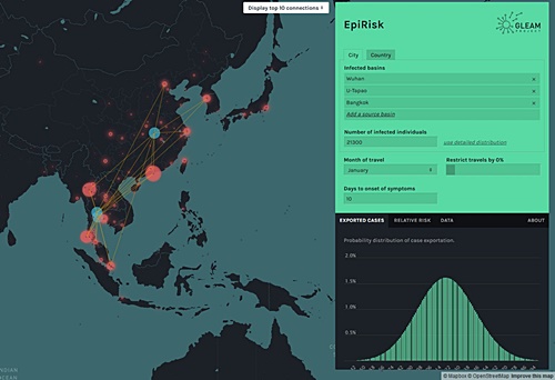 ส่วนนักวิจัยจากมหาวิทยาลัย Northeastern กับ EpiRisk เป็นแพลตฟอร์มที่ออกแบบมาเพื่อวิเคราะห์และประเมินความเสี่ยงการแพร่เชื้อโรคไปยังพื้นที่อื่น ๆ ทั่วโลก แสดงทั้งจำนวนผู้ติดเชื้อ ประเทศที่ติดเชื้อ โดยใช้ข้อมูลจากการเดินทางด้วยสายการบินต่างๆ ที่สำคัญมีไทยด้วย เป็นประเทศจุดหมายปลายทางลำดับต้นๆ ที่คนเมืองอู่ฮั่นนิยมเดินทางมาท่องเที่ยว เช่น ที่เชียงใหม่ ภูเก็ต หาดใหญ่ เป็นต้น