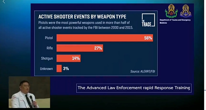 ขณะที่การศึกษาและงานวิจัยของต่างประเทศ พ.อ.นพ.ณัฐ ให้ข้อมูลว่า หน่วยงานที่ชื่อว่า The Advanced Law Enforcement rapid Response Training ได้เก็บข้อมูลการเกิดเหตุ Mass Shooting ในสหรัฐอเมริกา พบว่า ร้อยละ 56 ผู้ก่อเหตุจะใช้ปืนพก ร้อยละ 27 เป็นปืนไรเฟิล (Rifle) ที่เหลือเป็นปืนลูกซองและอาวุธชนิดอื่น