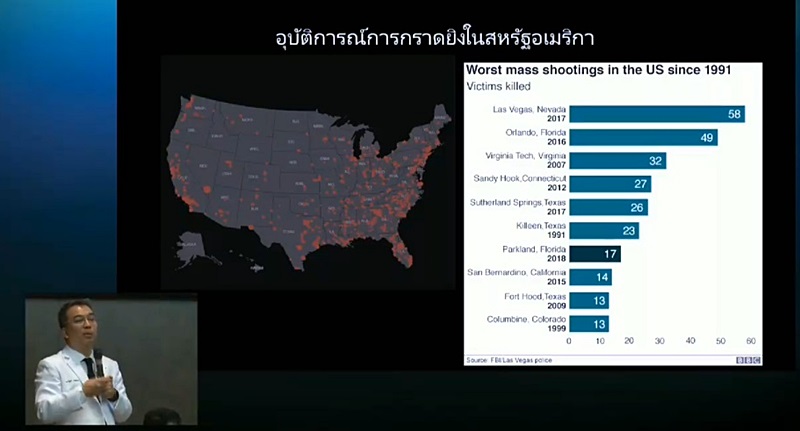 ขณะที่ รศ.นพ.รัฐพลี ภาคอรรถ คณะแพทยศาสตร์ จุฬาลงกรณ์มหาวิทยาลัย แสดงสถิติอุบัติการณ์การก่อเหตุกราดยิงในสหรัฐฯ ในรอบ 10 ปีที่ผ่านมา เมื่อเรียงตามจำนวนผู้เสียชีวิต หากสังเกตปี และจำนวนผู้เสียชีวิตมากสุด จะเห็นว่า ความรุนแรงที่มากขึ้นทุกปี สักวันหนึ่งจะเกิดที่บ้านเรา แต่เราไม่ได้คิดว่าจะมาเร็วขนาดนี้ เหมือนการก่อการร้าย การวางระเบิด ประเทศไทยก็เกิดขึ้นแล้วเช่นกัน