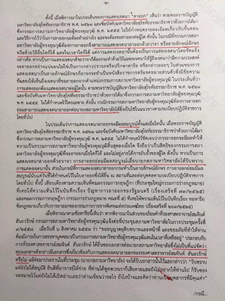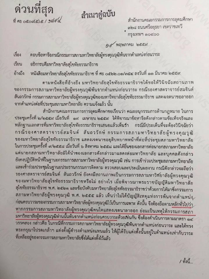 ทั้งนี้ ให้เหตุผลว่า เมื่อพิจารณาพระราชบัญญัติ (พ.ร.บ.) มหาวิทยาลัยสุโขทัยธรรมาธิราช พ.ศ.2521 และข้อบังคับมหาวิทยาลัยสุโขทัยธรรมาธิราชว่าด้วยการได้มาซึ่งกรรมการสภามหาวิทยาลัยผู้ทรงคุณวุฒิ พ.ศ. 2555 มิได้บัญญัติเหตุแห่งการพ้นตำแหน่งก่อนครบวาระของกรรมการสภามหาวิทยาลัยผู้ทรงคุณวุฒิไว้เป็นการเฉพาะ ดังนั้น จึงต้องถือหลักทั่วไปว่า หากคนใดแสดงเจตนาลาออก ย่อมเป็นเหตุให้ท่านนั้นพ้นจากตำแหน่งก่อนครบวาระด้วยเช่นกัน