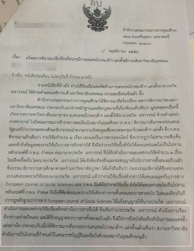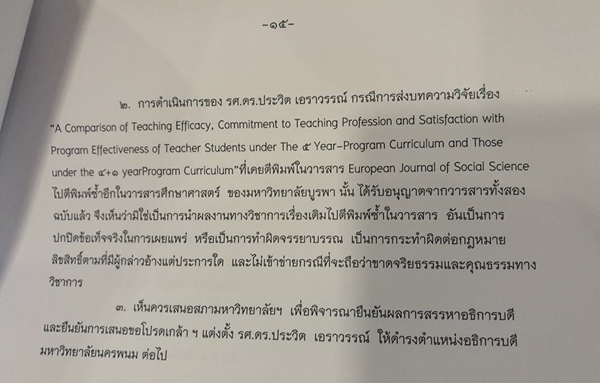 “ผมก็เอาหนังสือนี้ของสกอ. หารือกับวารสารศึกษาศาสตร์ มหาวิทยาลัยบูรพาว่า เมื่อบทความวิจัยยังไม่มีการเผยแพร่ ผมจะขอตีพิมพ์ใหม่ได้หรือไม่ แต่งานชิ้นนี้ผมเคยตีพิมพ์ในวารสารต่างประเทศ ทางมหาวิทยาลัยบูรพาก็ยินดี ผมก็ได้ส่งอีเมล์ไปยังวารสารต่างประเทศว่า ผมไม่สามารถค้นข้อมูลบทความวิจัยฉบับเต็มได้ มีแต่บทคัดย่อ ผมขอถอนการตีพิมพ์ และขอนำไปตีพิมพ์ใหม่ เขาก็มีหนังสืออนุญาต จึงเป็นที่มาที่วารสารศึกษาศาสตร์ มหาวิทยาลัยบูรพาตีพิมพ์ผลงานให้ ซึ่งไม่ใช่การลอกเลียนผลงาน หรือตีพิมพ์ซ้ำแต่อย่างใด”
