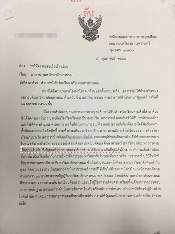 “หรือแม้กระทั่งเมื่อผมได้รับการโปรดเกล้าฯ เมื่อวันที่ 8 ม.ค.2560 สกอ.ก็มีหนังสือสั่งการมาที่มหาวิทยาลัยนครพนม ขอให้ตรวจสอบกรณี การถูกแอบอ้างชื่อร้องเรียน ปัจจุบันมีการตั้งกรรมการสอบข้อเท็จจริงแล้ว และอาจารย์ท่านดังกล่าวก็แจ้งความดำเนินคดีผู้แอบอ้างแล้วเช่นกัน เพราะการแอบอ้างนั้นทำให้ผู้บังคับบัญชาเข้าใจผิด”
