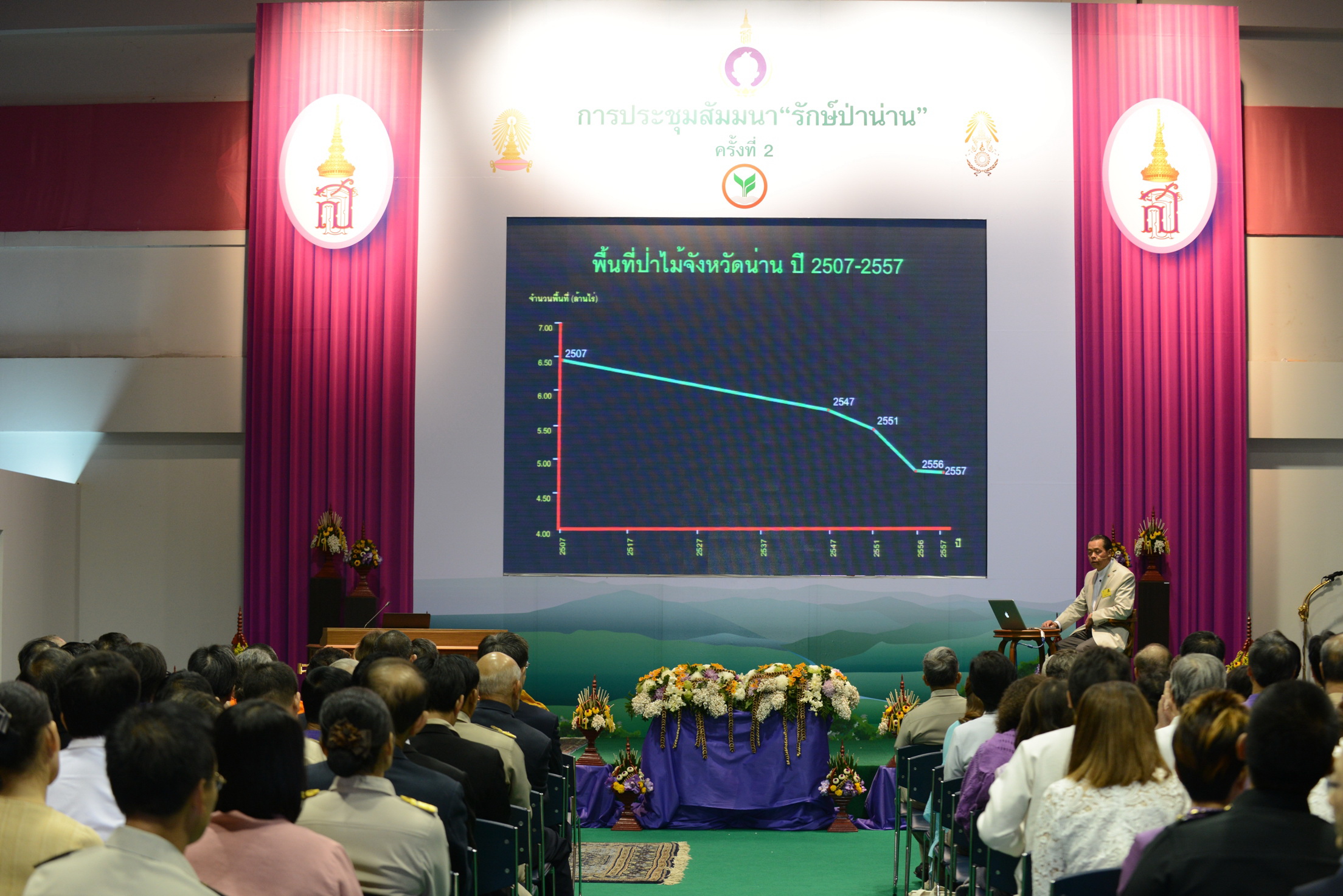 ในโอกาสครบรอบ 1 ขวบปี ของการดำเนินงาน ผลเป็นอย่างไรนั้น ในการประชุมสัมมนา ‘รักษ์ป่าน่าน ปี 2’ ณ ศูนย์การเรียนรู้และบริการวิชาการ เครือข่ายแห่งจุฬาลงกรณ์มหาวิทยาลัย อ.เมือง จ.น่าน เจ้าสัวบัณฑูร นำเสนอผลการดำเนินงาน ผ่านการบรรยายพิเศษ เรื่อง ‘รู้รักษ์ป่า รู้รักษ์น้ำ’ โดยเริ่มต้นนำเสนอภาพสรุปว่า จ.น่าน มีพื้นที่ป่าสงวนแห่งชาติ ร้อยละ 85 ซึ่งส่วนใหญ่เป็นภูเขา นับเป็นลักษณะพิเศษที่หาไม่เจอในจังหวัดอื่น